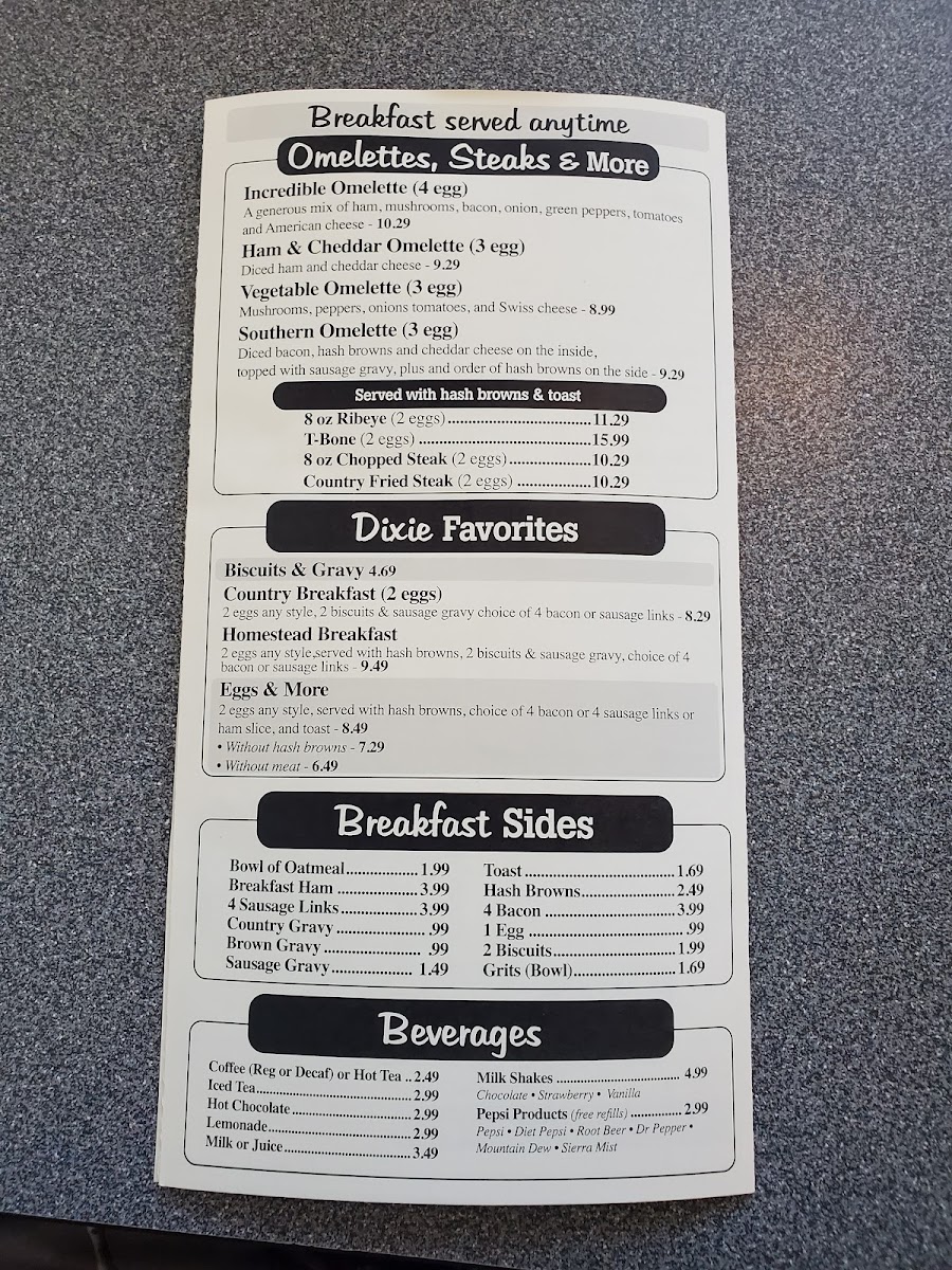 Breakfast is a highlight here, with comforting dishes like fluffy omelets, stacks of loaded French toast, and generous portions of eggs, pancakes, and sausage. Whether you're starting your day with a savory Southern omelet or a simple bowl of oatmeal, the menu supports a leisurely morning or a quick, fulfilling bite.