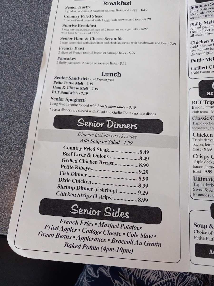Later in the day, the menu shifts to robust, homestyle meals such as Philly cheese steak sandwiches, roast beef dinners, and seafood combos—each plate generous and made for sharing conversation as much as appetite. Sides like hash browns, biscuits and gravy, and onion rings complement the main dishes, helping keep the atmosphere casual and approachable.